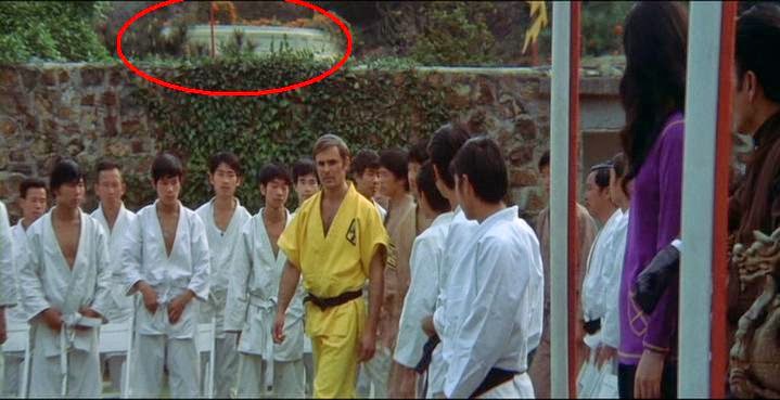 On trouve également un petit bâtiment circulaire épargné par la démolition. Il s’agissait probablement d’une petite dépendance dans le jardin avec toilettes. Il semblerait qu’elle ait été utilisée par la star féminine du film comme vestiaire… et par Bruce Lee également, jaloux de ce privilège!